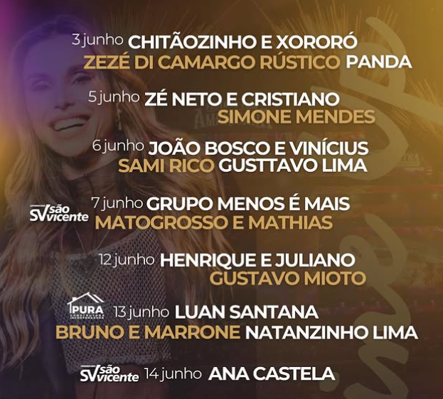 | 06/jun | Sábado BV SEM OPEN | Gusttavo Lima João Bosco e Vinícius Sami Rico | Barra Funda Tatuapé Jundiaí / Vinhedo / Campinas |