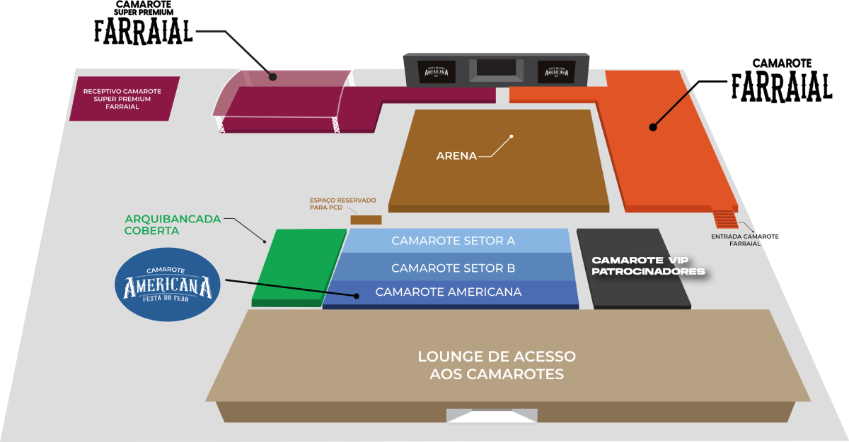 Camarote farraial – Vista privilegiada dos shows, acesso a frente do palco exclusiva, bares , alimentação e banheiros exclusivos e muito conforto para assistir os shows da melhor forma